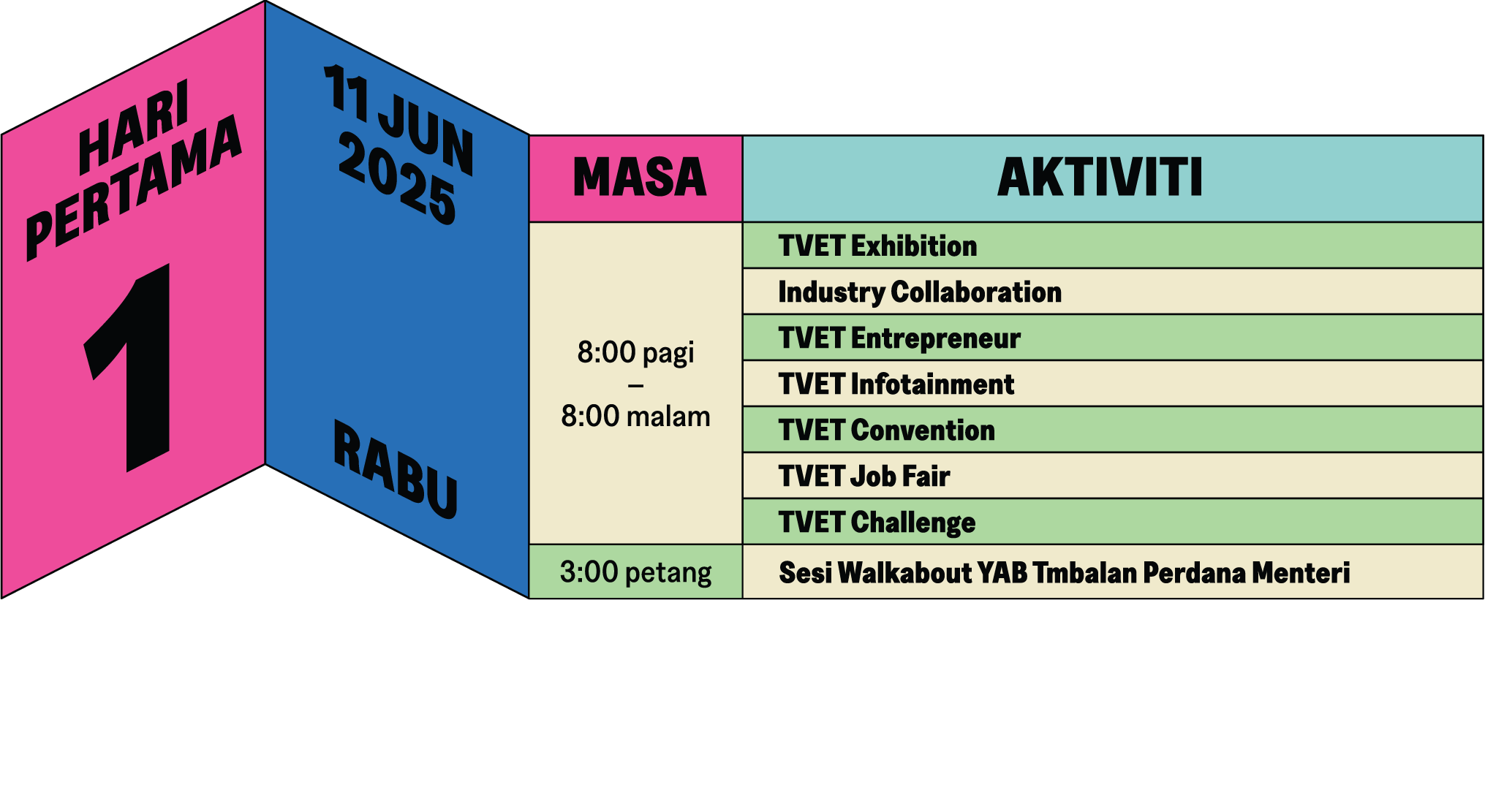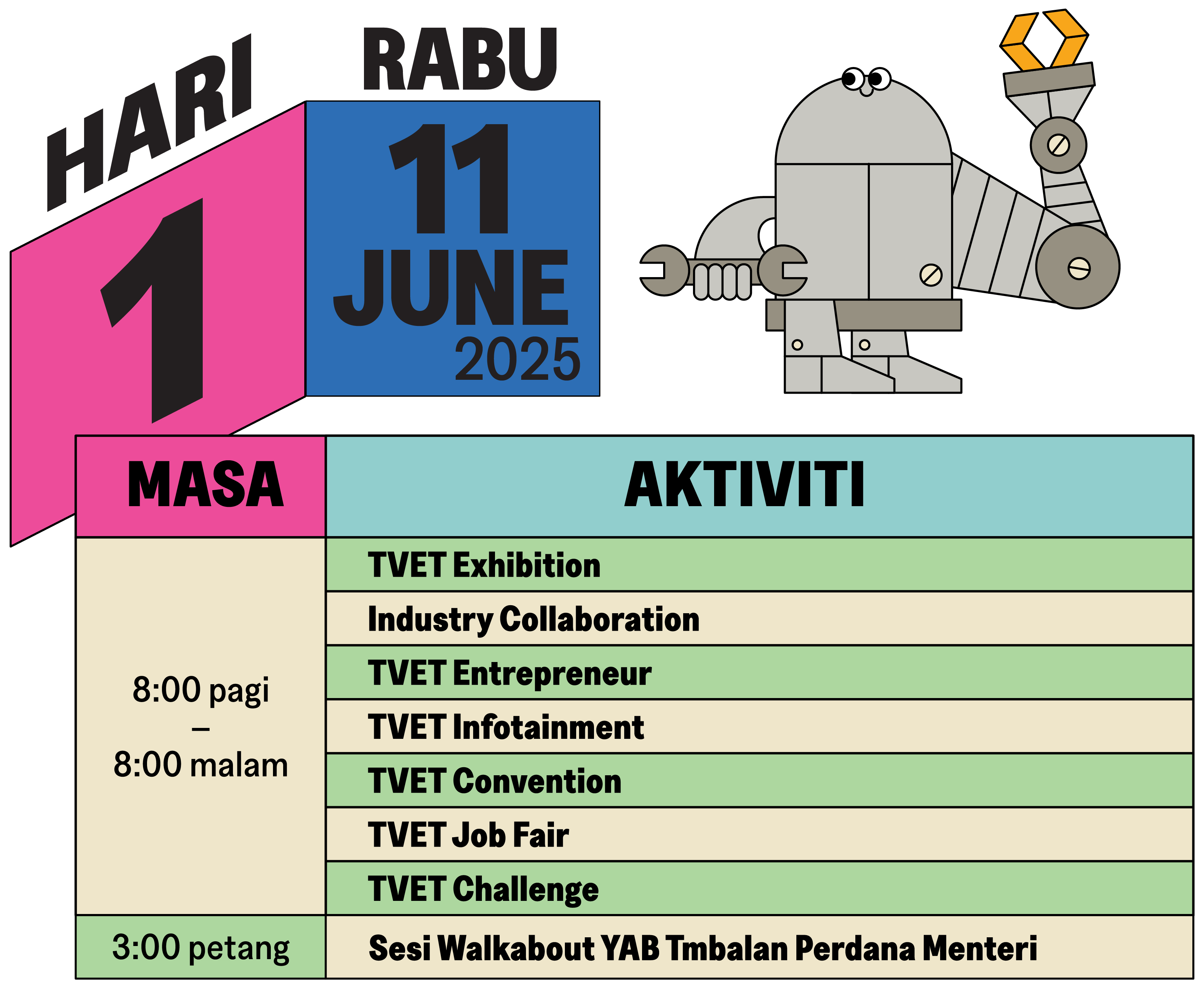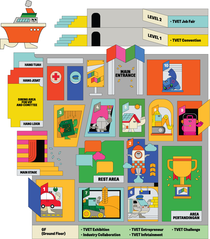 TVET Exhibition merupakan komponen utama Hari TVET Negara 2025, menghimpunkan kesemua 12 kementerian yang terlibat dalam pendidikan dan latihan teknikal dan vokasional (TVET) di Malaysia. Pelawat boleh menerokai teknologi terkini yang dipamerkan oleh rakan kongsi industri, menyertai hari terbuka TVET dan menyaksikan demonstrasi kemahiran yang mengagumkan dari Institusi TVET yang mengambil bahagian. Jangan lepaskan peluang ini untuk terlibat dengan perkembangan terkini dalam TVET.