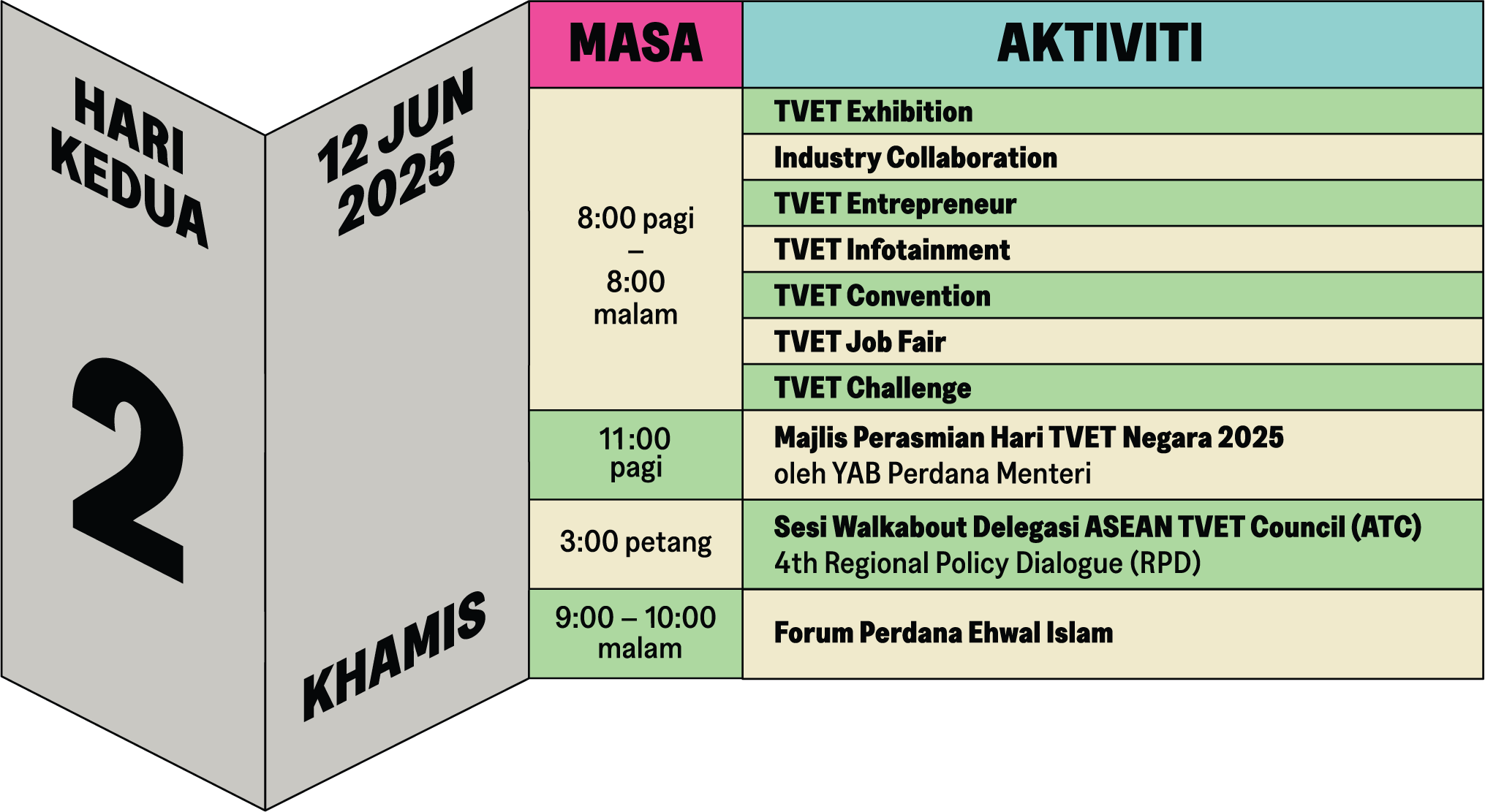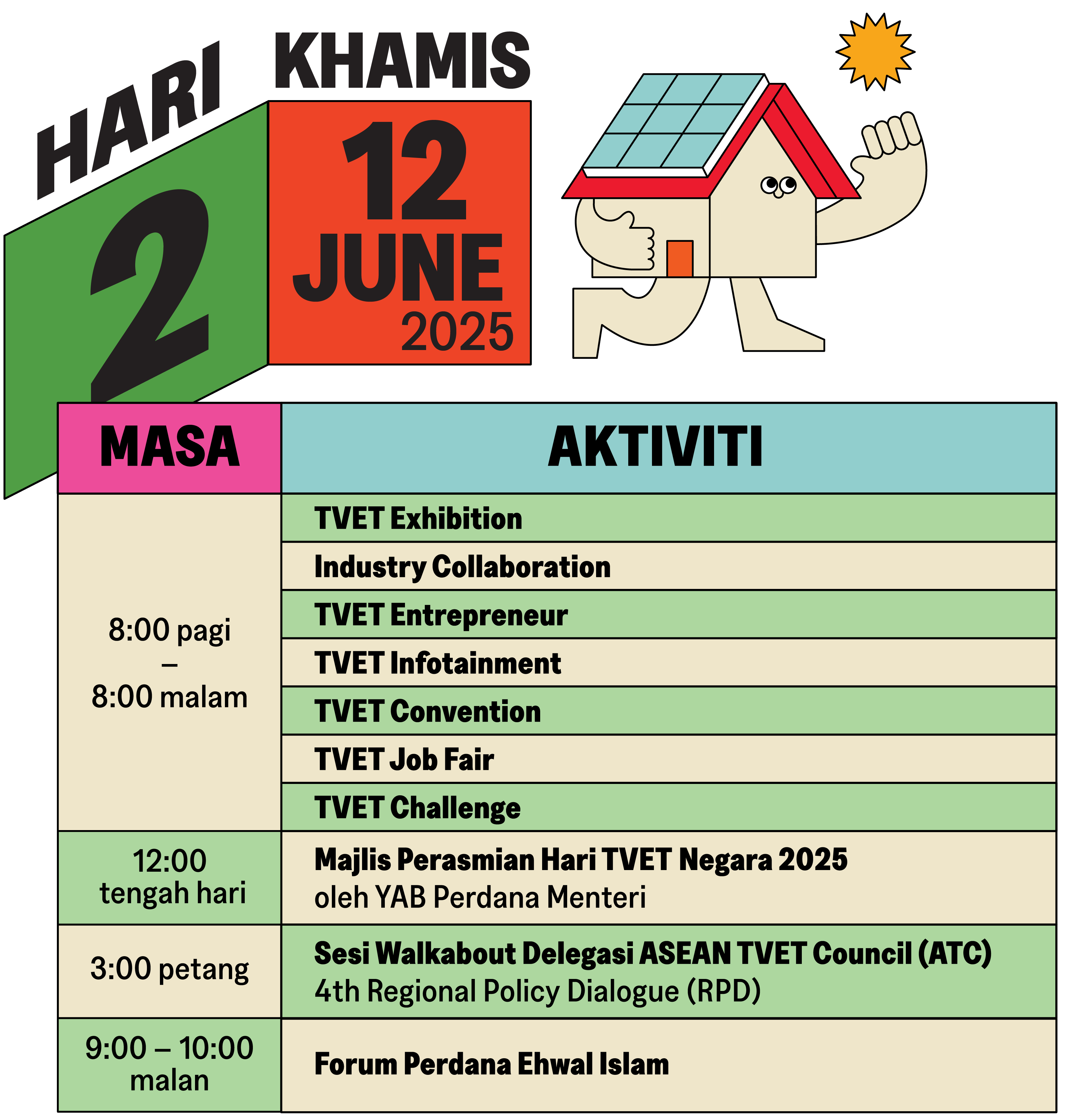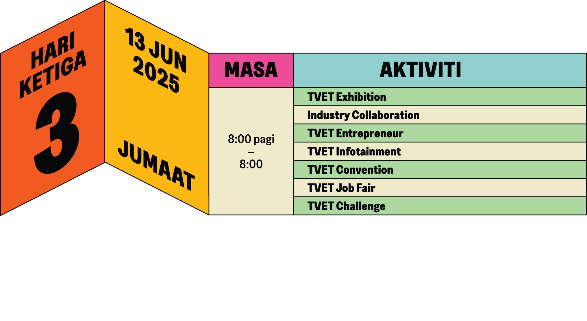 TVET Exhibition merupakan komponen utama Hari TVET Negara 2025, menghimpunkan kesemua 12 kementerian yang terlibat dalam pendidikan dan latihan teknikal dan vokasional (TVET) di Malaysia. Pelawat boleh menerokai teknologi terkini yang dipamerkan oleh rakan kongsi industri, menyertai hari terbuka TVET dan menyaksikan demonstrasi kemahiran yang mengagumkan dari Institusi TVET yang mengambil bahagian. Jangan lepaskan peluang ini untuk terlibat dengan perkembangan terkini dalam TVET.