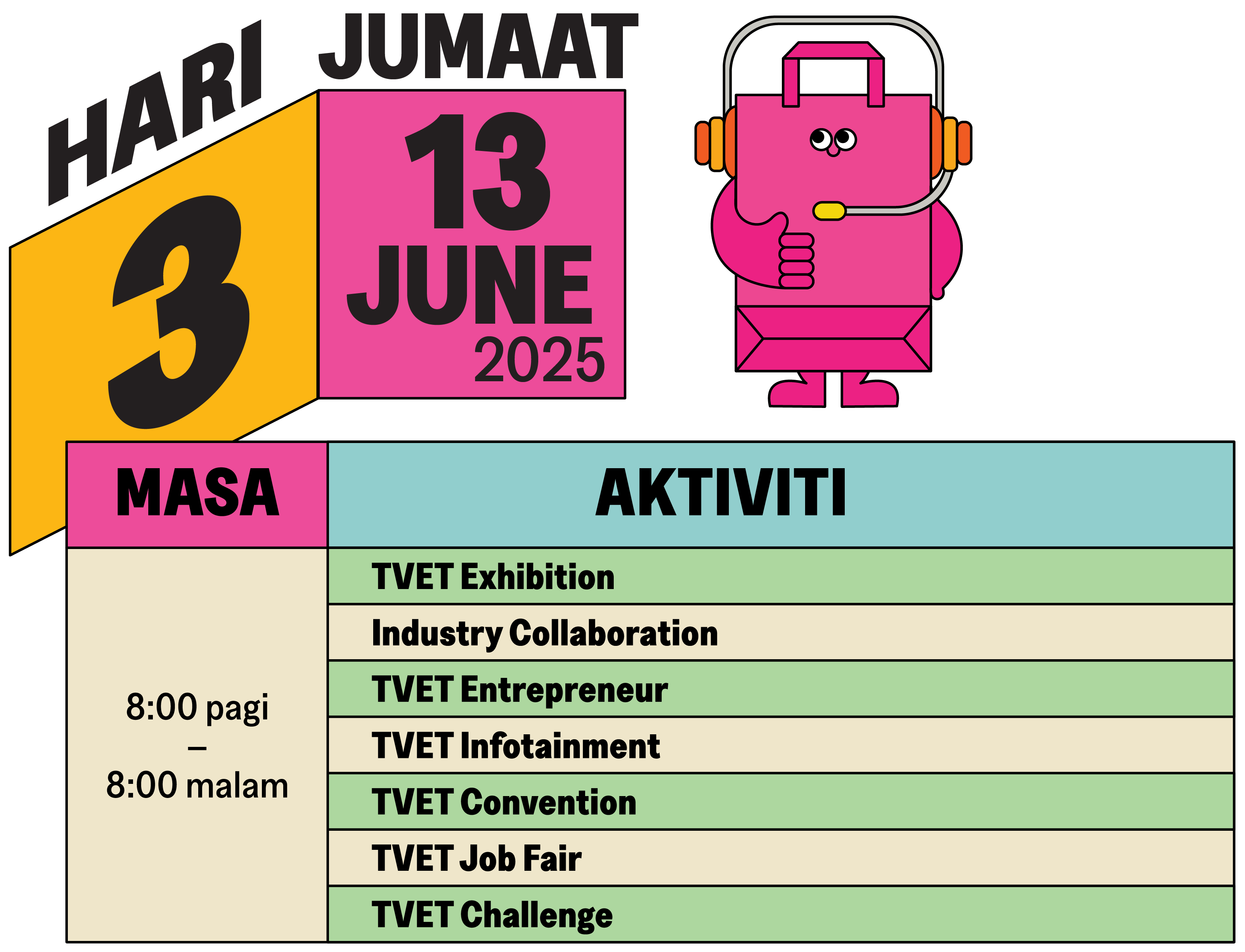 TVET Convention menampilkan dua aktiviti utama yang memberi penekanan kepada revolusi data, inovasi dan pemerkasaan pengajar TVET dalam mendepani perubahan landskap pekerjaan masa hadapan. Hub ini menjadi medan pertemuan golongan pendidik, pakar industri dan pemegang taruh bagi memperkukuh ekosistem latihan kemahiran negara melalui perkongsian ilmu, amalan terbaik dan pemikiran strategik.
