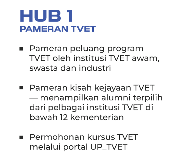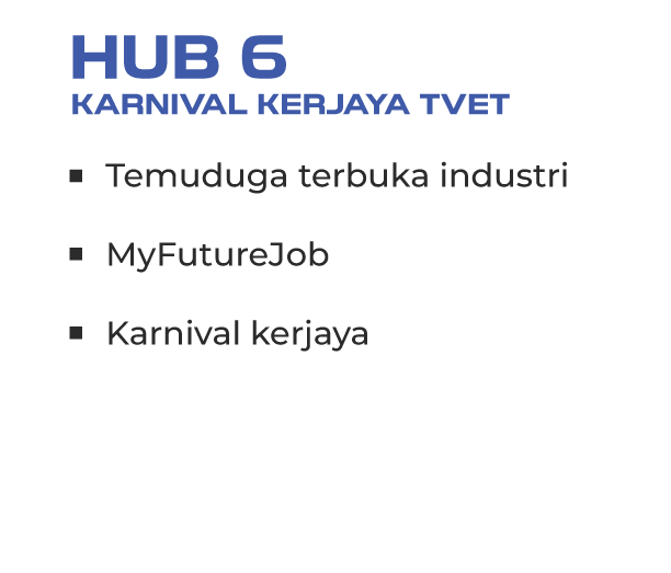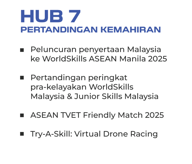 TVET Challenge merupakan pentas kompetitif yang menghimpunkan pelatih kemahiran dari dalam dan luar negara bagi menguji kemahiran teknikal, kreativiti dan daya saing mereka dalam pelbagai bidang berimpak tinggi. Hub ini memperlihatkan kesungguhan Malaysia dalam memartabatkan kemahiran sebagai kerjaya pilihan, selari dengan standard antarabangsa seperti WorldSkills.