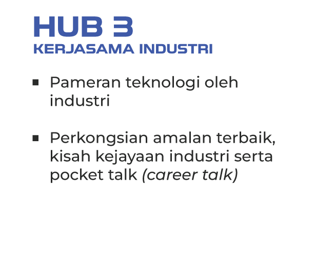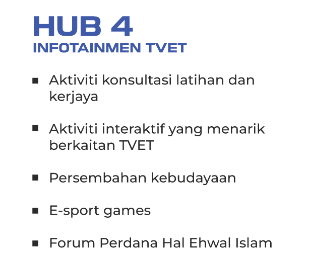 Hub 4 menampilkan pelbagai aktiviti interaktif dan bermanfaat yang membolehkan pengunjung merasai sendiri pengalaman dunia TVET secara langsung. Dirangka dengan pendekatan yang inklusif dan menyeronokkan, hub ini menjadi ruang pertemuan antara institusi TVET, mahasiswa, pelajar, dan masyarakat umum bagi memupuk minat terhadap pendidikan dan latihan teknikal.