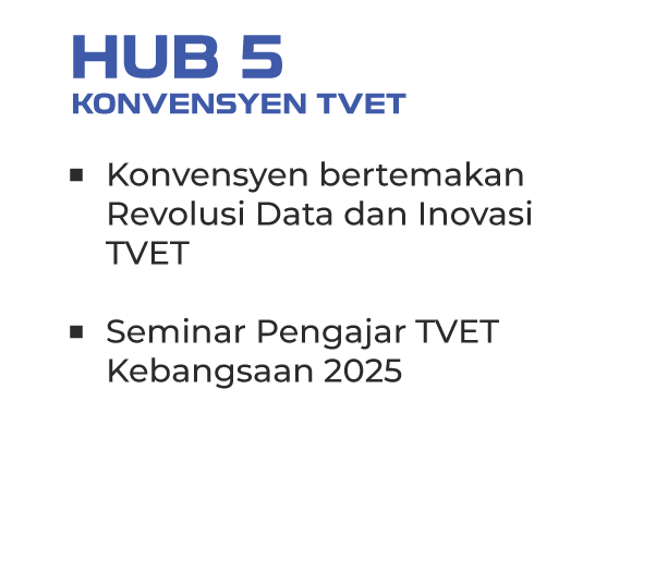 TVET Convention menampilkan dua aktiviti utama yang memberi penekanan kepada revolusi data, inovasi dan pemerkasaan pengajar TVET dalam mendepani perubahan landskap pekerjaan masa hadapan. Hub ini menjadi medan pertemuan golongan pendidik, pakar industri dan pemegang taruh bagi memperkukuh ekosistem latihan kemahiran negara melalui perkongsian ilmu, amalan terbaik dan pemikiran strategik.
